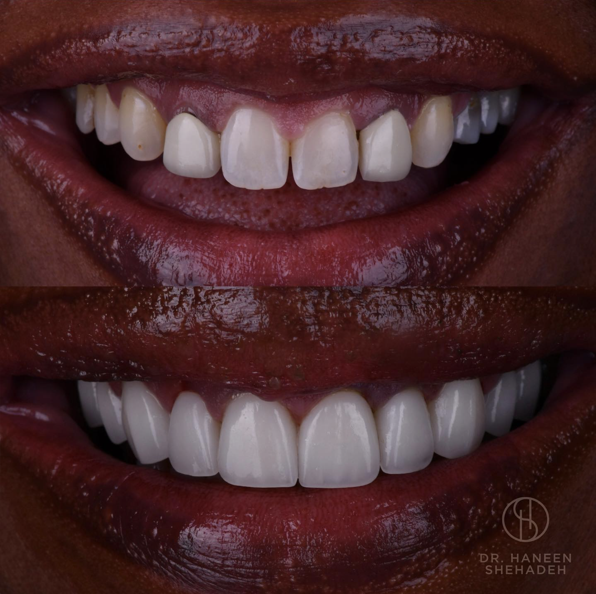 This smile makeover included a gum lift, 10 porcelain veneers and a lower teeth whitening treatment.